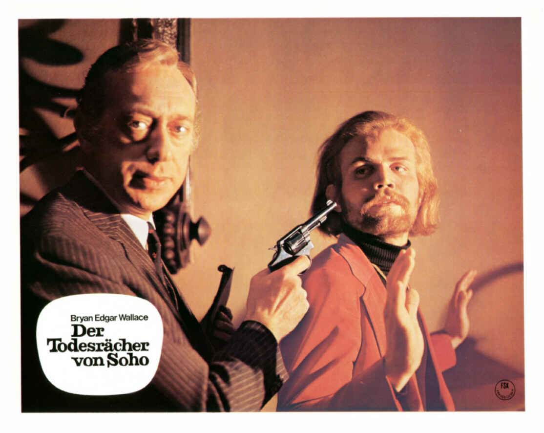 In order to pay penance for my prior lack of respect for Señor Franco, here are some German lobby cards for this last in the series of Bryan Edgar Wallace films by Artur Brauner’s CCC Film, a remake of its first entry (Das Geheimnis der schwarzen Koffer/The Secret of the Black Trunk, 1962), and also arguably the last classic Krimi.